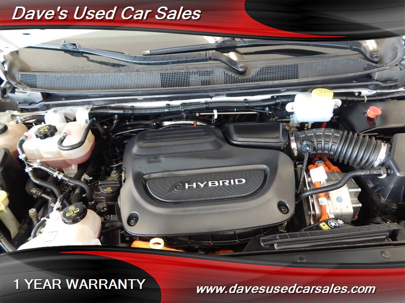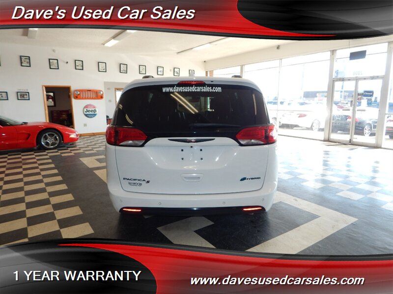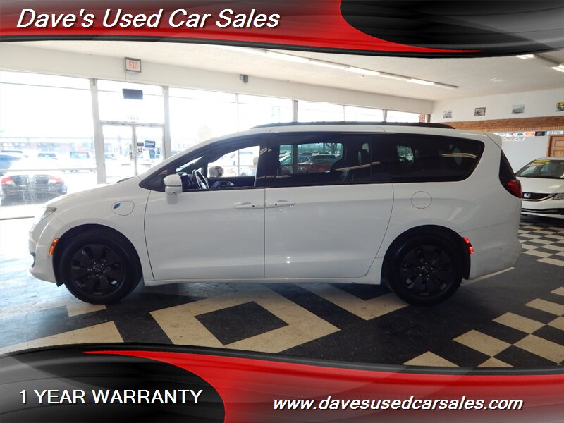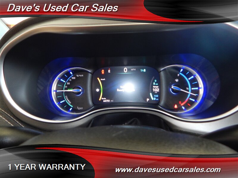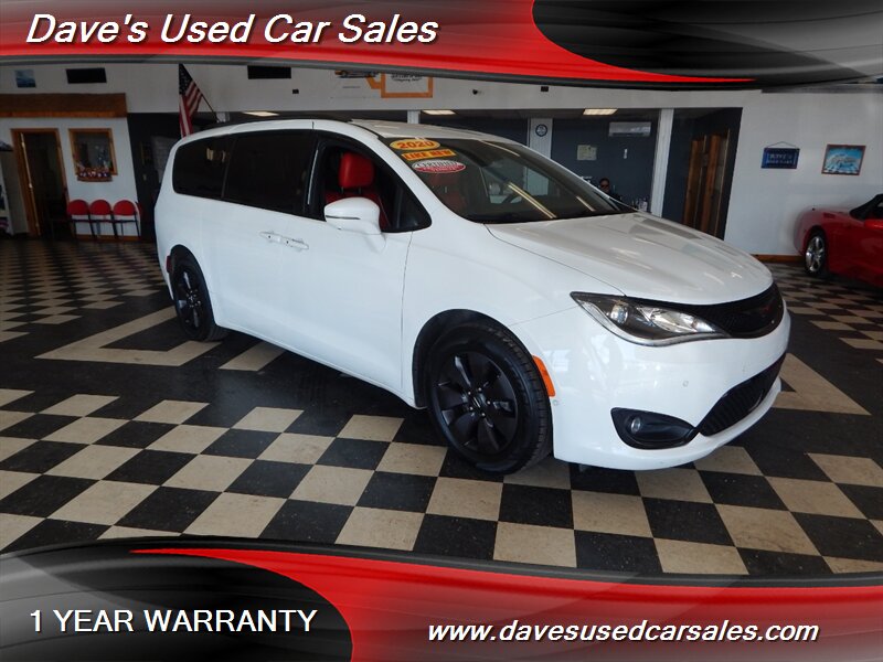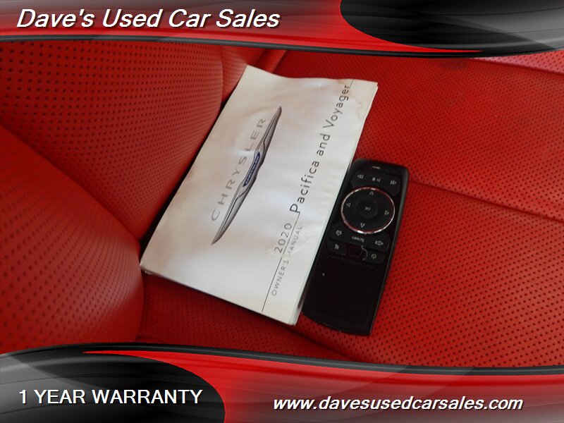 2020 Chrysler Pacifica Limited Red S — Bright White Clear Coat exterior with Rodeo Red interior. This Pacifica is powered by the Pentastar 3.6L Plug-in Hybrid V6 producing a combined 260 horsepower, delivering the smooth, responsive power expected from Chrysler’s hybridized V6 family. The vehicle’s fuel economy is listed at 29 MPG city and 30 MPG highway, and the odometer shows below 65,000 miles (averaging under 10,000 miles per year), reflecting careful, low-use ownership.