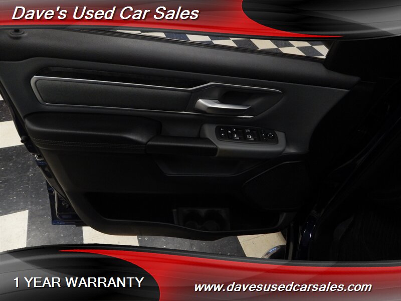 The exterior of this RAM 1500 is finished in a striking Patriot Blue Pearl Coat, which not only enhances its rugged appearance but also provides a sleek and glossy finish. The vehicle's design is complemented by bold lines and an aggressive stance, making it a standout on the road.