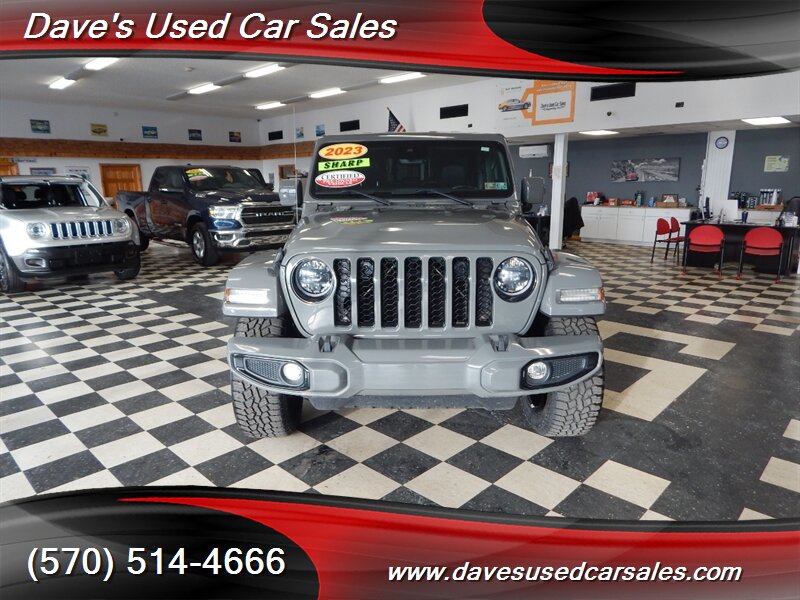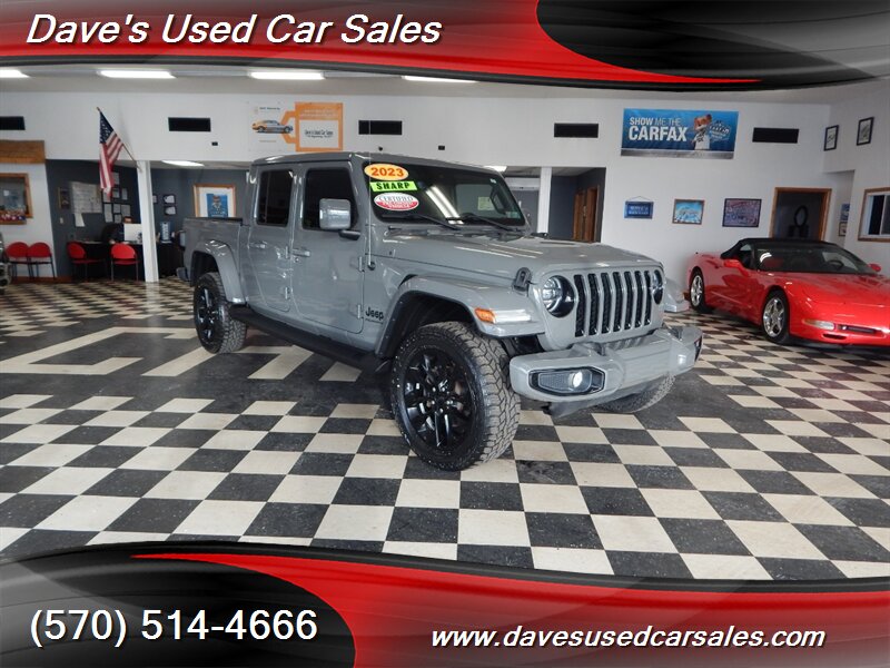 2023 Jeep Gladiator High Altitude — Sting-Gray Clear Coat exterior, Black interior. Powered by a 3.6L V6 producing 285 hp and 260 lb-ft of torque, paired with an 8-speed automatic transmission and a capable four-wheel-drive system. EPA-estimated fuel economy is 17 MPG city and 22 MPG highway.