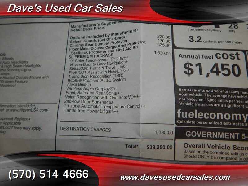 - SL Premium PackageIncludes 9 inch color touch-screen display, Nissan door to door navigation, SiriusXM Traffic, SiriusXM Travel Link, BOSE premium audio system, 10 speakers including dual driver subwoofer, wireless Apple CarPlay, voice recognition with one shot VDE, ProPILOT assist with Navi-link, front and rear sonar, second row door sunshades, and traffic sign recognition