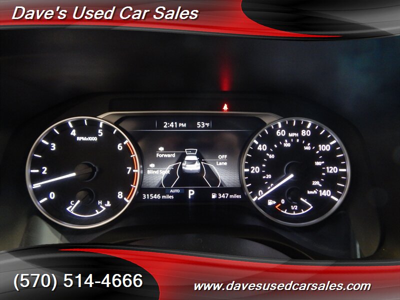 - Safety and driver assistance: Nissan Safety Shield 360 suite of driver-assist technologies including Automatic Emergency Braking with Pedestrian Detection, Blind Spot Warning, Rear Cross Traffic Alert, Lane Departure Warning, and High Beam Assist. RearView Monitor is included for backing maneuvers. Additional standard active and passive safety systems (airbags, ABS, electronic brake force distribution) are factory fitted.