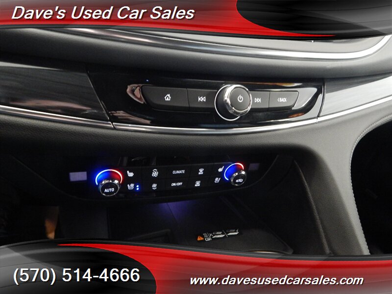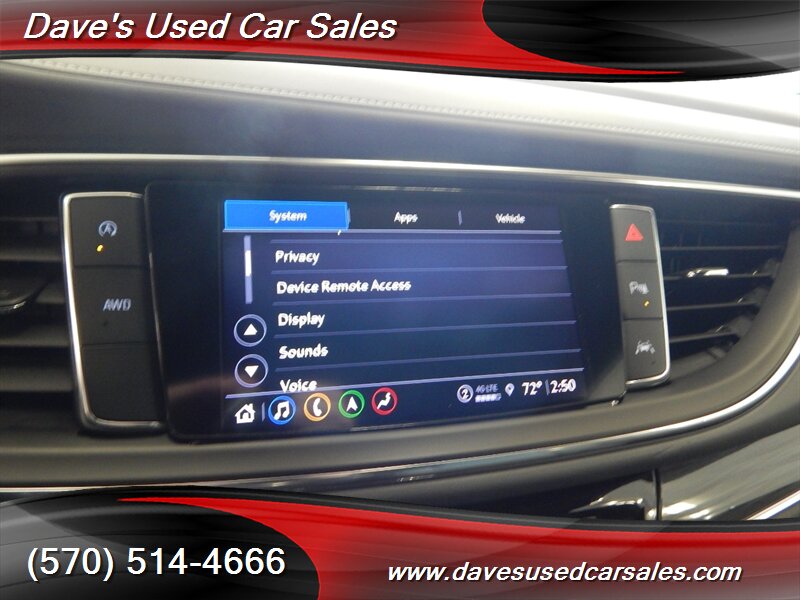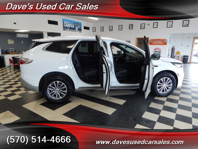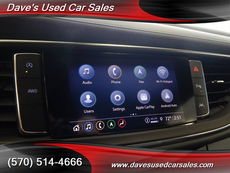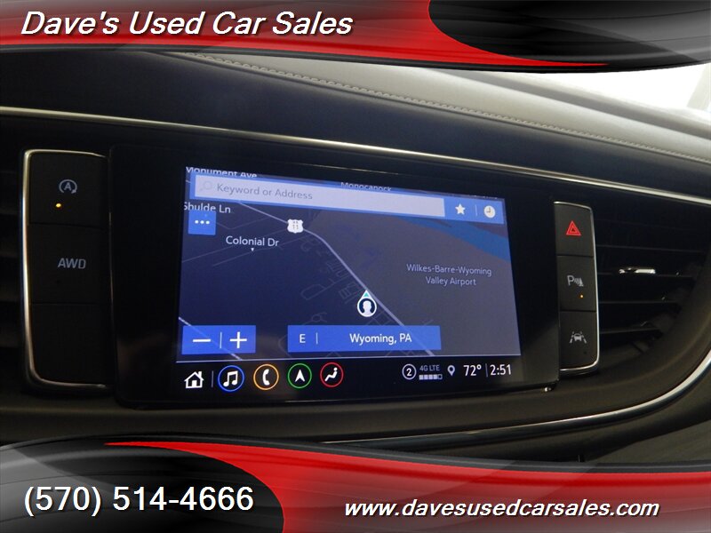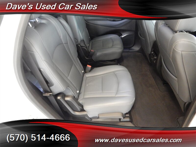 The exterior of this Enclave Premium is finished in an eye-catching White Frost Tricoat, a color that exudes sophistication and elegance while enhancing the vehicle's overall aesthetic appeal. The glossy paint not only adds to the vehicle's visual allure but also signifies the care taken to maintain its pristine condition. The sleek lines and sculpted body of the Enclave contribute to its aerodynamic profile, while the bold front grille and signature LED headlights provide a commanding presence on the road.